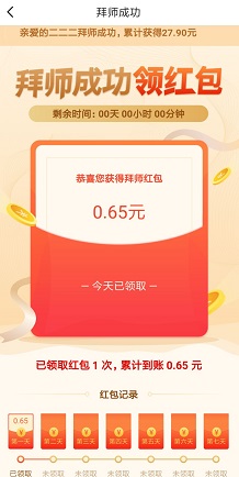 3.登录后,点击“我的”-“拜师领红包”,首次会提示绑定微信,直接领取,金额随机,亲测0.65元,秒到微信零钱!