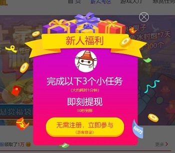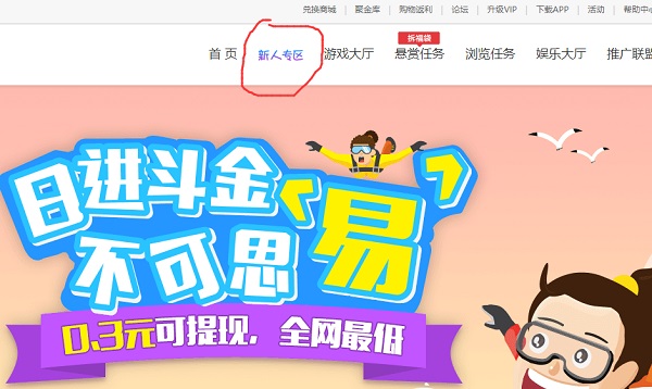 2.完成新人指引后,我们点击网站新人专区页面进入,一天可以签到一次,然后去做新手任务,可以选择页游试玩、QP试玩、娱乐竞猜等等。