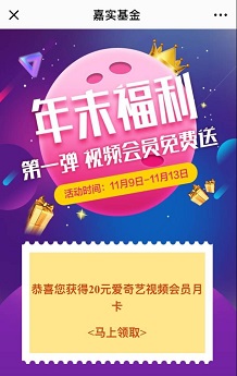 应该是只有嘉实基金的老用户参与,可以免费抽到价值20元爱奇艺会员月卡一张!