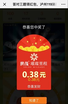 一共3道题,全部答对后,抽奖必中,亲测0.38元。(分享朋友圈多一次机会)