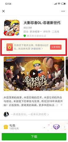 腾讯每次推一些重磅新手游的时候,都会针对性送一些新用户微信红包,之前推过好几次,这次又是“火影忍者OL”新用户下载后,登录创建一个角色,即可免费领取6元微信红包,秒推送。手慢无!