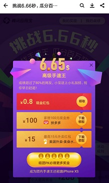 打开应用宝,首页轮播图片“拼手速瓜分百万现金”活动进入(有时在右下角图标),点击开始挑战,在接近6.66秒时按停止,根据成绩出奖励,亲测一次0.8元,每天3次机会,分享再得2次。