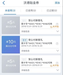 1.首先这次才绑卡的小伙伴到交通银行app-我的-“沃德贴金券”看下是否和我一样,有3张券。