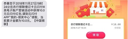 5.支付后坐等几分钟,会收到一条短信,提示你在云闪付app“卡管理”右上角小人图标进入我的页面,选择“领奖中心”-“消费赚红包”即可看到有10元,手动领取下。