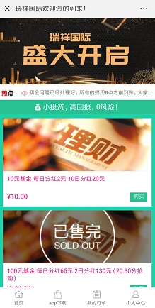 通常带“国际”平台,其实一点也不国际,之所以这样取名,无非想让自己包装的高大上,忽悠下不知情的群众,比如这个叫“瑞祥国际”注册免费赠送10元,可购买理财产品,每天分红2元,签到1.5元,最低20元起提现!