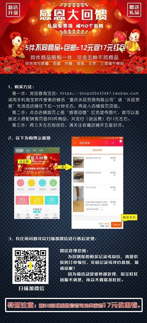 第三步:两三天显示收到货后,请关注收藏店铺并五星好评,加微信把已评价裁图给微信,微信确定是你后,马上给你发个红包,支付金额+5元,即17元。(广告中的17元优惠卷=17元现金红包)