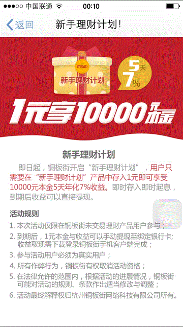 进入后完成注册,下载铜板街APP,在“理财产品”选择“新手理财计划”购买,存入1元即可获取10000元体验金,这10000元体验金可产生5天7%年化率的收益,共计9.6元。到期后可以直接和投资的1元一起提现到银行卡里。