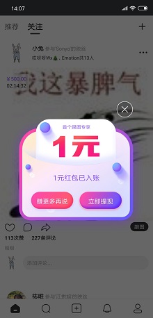 输入手机号,下载app,登录后,随便打开一个人的动态,点击跟图,任意上传个图片,可免费获得1元红包。