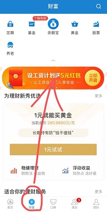 打开手机支付宝,财富,在轮播图片里,找到设工资理财计划送5元红包的活动。(不是所有人都有的,看脸)