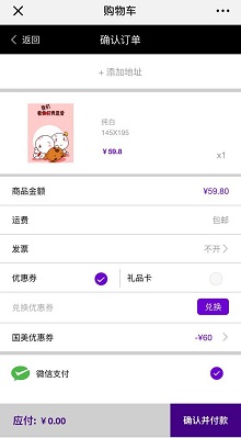 4.最后提交,填写好收货地址,确认付款,一分钱都不用花。(若在微信端添加不了地址,就点击菜单栏“用户中心”-“关于我们”下载app,微信登录后,在app里填写地址,再回到微信提交)
