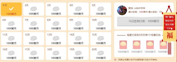 一天1000聚币,20天就是20000聚币(相当于2元现金),每累计签到5天再得1个惊喜红包(需要累计提现满1元),18888聚币,算下来,靠这个签到活动,咱们20天都能免费赚9元以上!