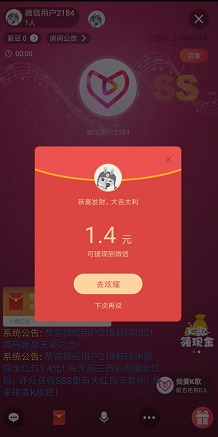 3.亲测唱了一首陈奕迅的《淘汰》获得1.4元红包,一天有3次机会获得红包,分享到朋友圈也有几毛的红包,一天能分享3次,间隔至少20分钟!不过唱歌和分享红包总量有限,刚才我唱第二首歌后就提示今天红包抢完了!