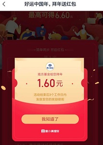 下载度小满理财,登录百度帐号,从首页进入“度小满 拜年送红包”活动,完成风险测评和添加自选基金,可免费领取0.6-6.6元红包,亲测1.6元!