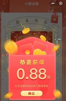 需要至少2个微信号,小号微信搜索小程序“小猪送福”进入分享一张贺卡给大号,大号点开直接拆红包。