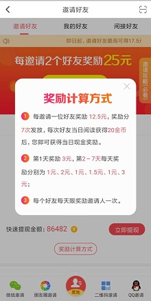 4.每邀请一个好友额外奖励12.5元,一共分7天发放,每天只需要用被邀请的号打开随便看篇文章都几百金币,超过规定的20金币。