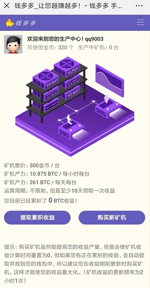 前几天有读者留言问我最近出来个钱多多挖坑知道不,我印象中只有个钱多多牧场,还是两年前的事,当时还火了一段时间,今天正好找到读者所说的新的钱多多挖坑,注册实名认证后,免费赠送300金币,可买一台矿机,每天产生0.26元收益,最低1元起提现!