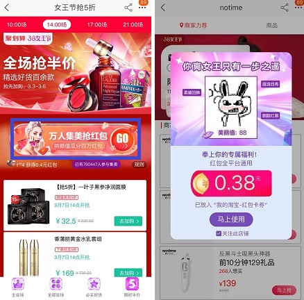 昨天推苏宁的活动时,推了天猫女王节红包活动,今天又发现一个“万人集美”活动,手机淘宝扫码进入,亲测抽到3个0.38元红包,还有人抽到10个,可用来购物时抵扣现金。每天最多能抽中12次,所以考验人品的时刻来了!