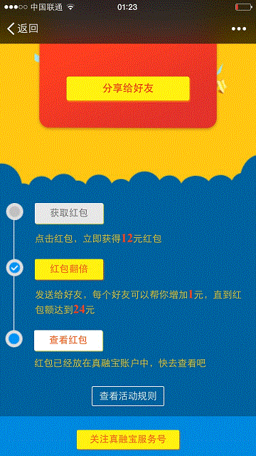 3.扫描后会进入活动页面,按提示操作可领取到12元红包。往下拉一点,点击“关注真融宝服务号”如下图所示: