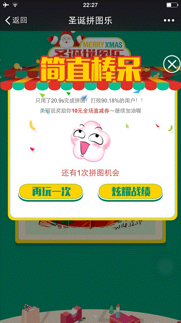 然后会自动跳转到活动页面。是个拼图的小游戏,在规定的时间内,完成拼图,时间越短获取的优惠券的几率越高!