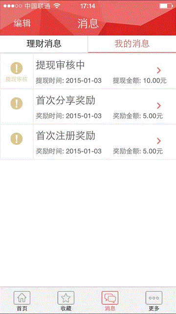 3.接着在首页选择任意一款理财产品,点击“分享”,或者点击“更多-我的二维码。或者“更多-设置-邀请好友”分享给好友,分享后记得选择返回招财,这样即可再获取5元奖励。