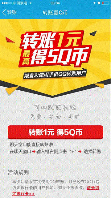 打开你的手机QQ,点击"QQ钱包"-"转账"选择收款人,即可在你的好友中选择一个人,有多个QQ号的人,可以选择自己的QQ小号,完成1元的转账。如果你QQ钱包还没绑定银行卡,首次绑定后完成转账即可获得5Q币。如果你和我一样,之前已经绑定过银行卡,只能获得1Q币。