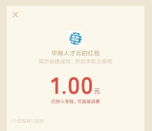 华商人才是一个招聘平台,当前新用户注册为会员后,完善个人简历后,平台会审核,通过自动推送1元微信红包,我是半个小时内到账的。由于看不到活动更多详情介绍,不知道结束时间等情况,抓紧上车就行了!