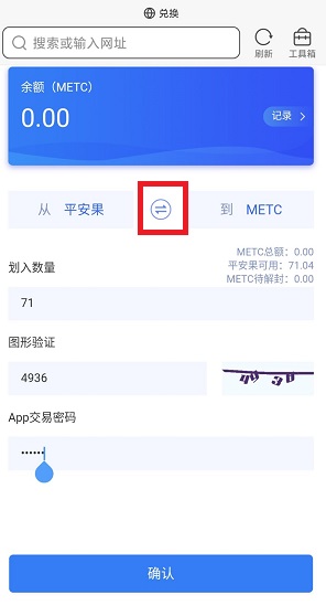 3.通过后,在“我的”-“兑换”绑定福音帐号,再点击切换按钮切成从“平安果”到“METC”。