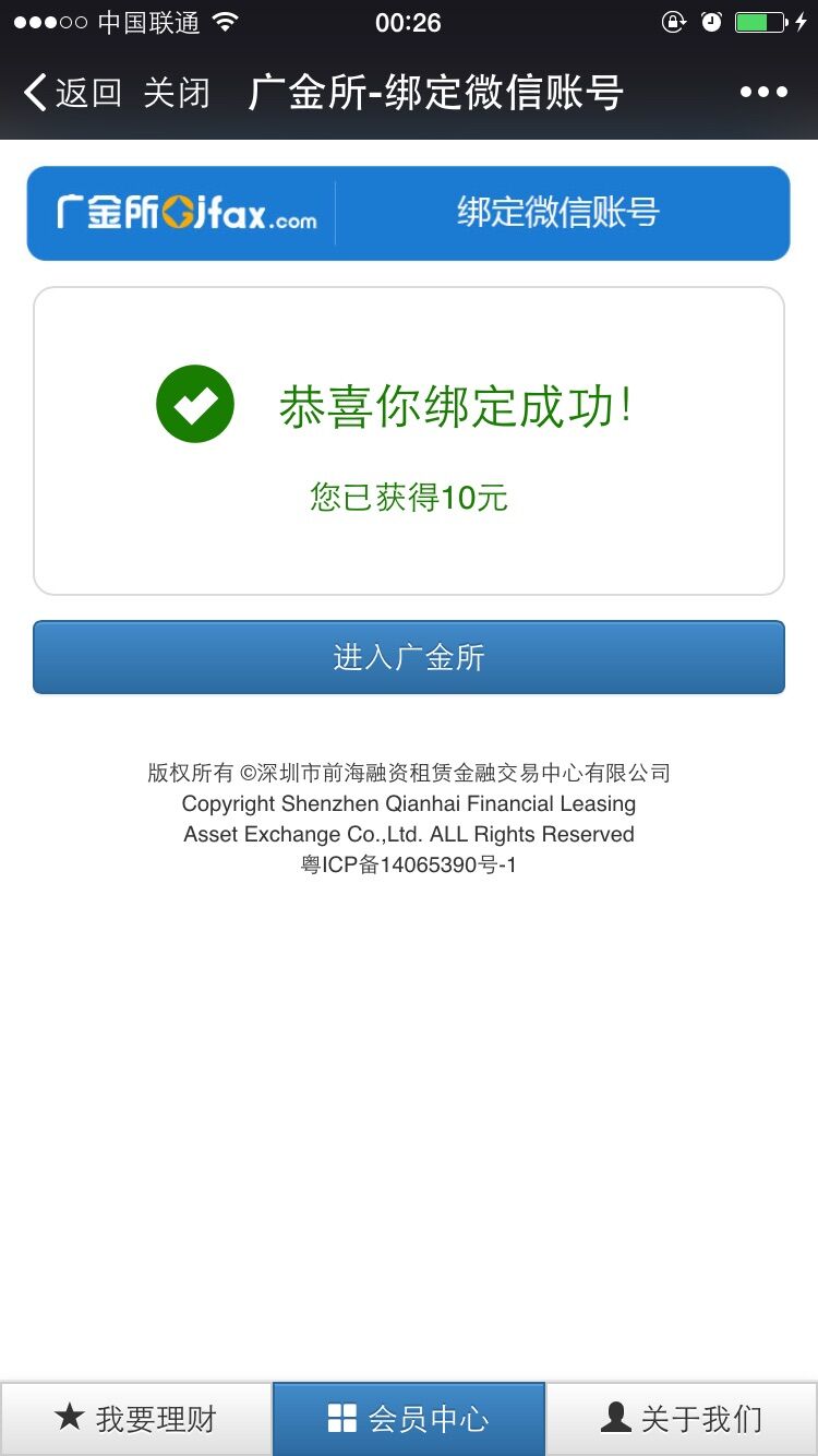 广金所是深圳市前海融资租赁金融交易中心有限公司创办的理财平台,该站起投资金比较大,也没什么特色,所以不做多介绍。目前针对新老用户有个绑定微信免费送10元现金的活动,我已参与,并且到账很快。活动马上就快结束了,还没参与的朋友们抓紧时间上!