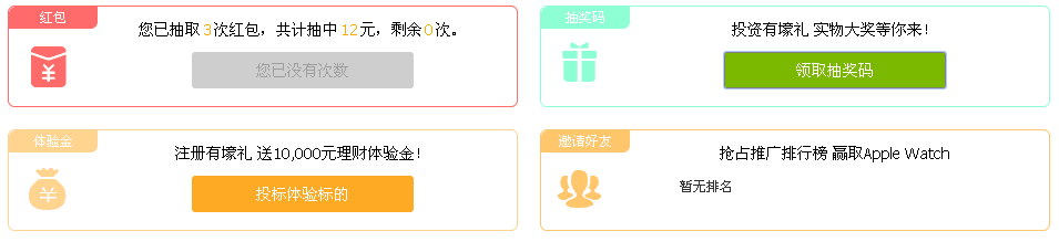进入后注册为会员,完成实名认证和银行卡绑定,然后打开http://10yi.yijiedai.com/ 抽奖页面即可看到3次抽奖机会和1万元体验金,如下图: