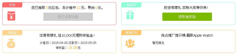 活动时间:2015年4月28日—5月15日(5月6日更新,体验金收益需要投资才能提现,抽中的红包可以直接提现!如果你没抽中2元以上,这个活动就可以放弃了!)