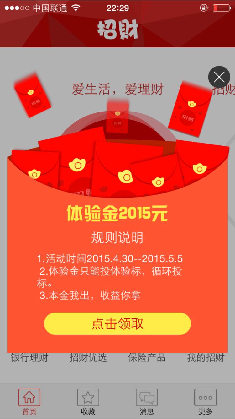 招财也是良心平台了,多次免费活动,奖励都顺利到账!这次五一,免费的活动再次来袭,新老用户均可参与,登录最新版招财app即送2015元体验金,最多可以投30天的体验标,据说有10元左右的利息,同样是可以直接提现的。如果暂时没30天的体验标,可以先等等,实在不行就投6天、15天的收益少一点。