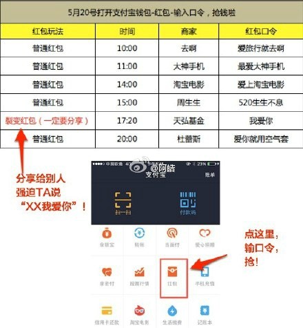 今天是5月20日,520谐音我爱你,目测又有一大批秀恩爱的情侣霸占咱们的手机和电脑屏幕。为了安抚这些单身屌丝们,支付宝联合商家做了抢红包的活动,大家只需打开手机支付宝,简单的输入对应的红包口令,即可随机获得几毛不等的现金,奖励虽少,但抢的人非常多呢!