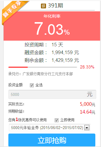 注册为会员,完成实名认证,在体验金领取页面https://www.fuyph.com/userCenter/coupon/getCouponMoney拉到页面下方,点击“立即参与”即可领取到5000元体验金,点击“我要投资”-“福票通”选择“新手专享”即可投标,一般在10天以上,我投的是15天的标,有14.64元收益。