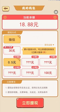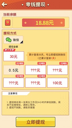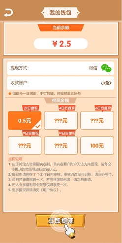 次日登录后,直接提现0.5元,秒到微信零钱!
