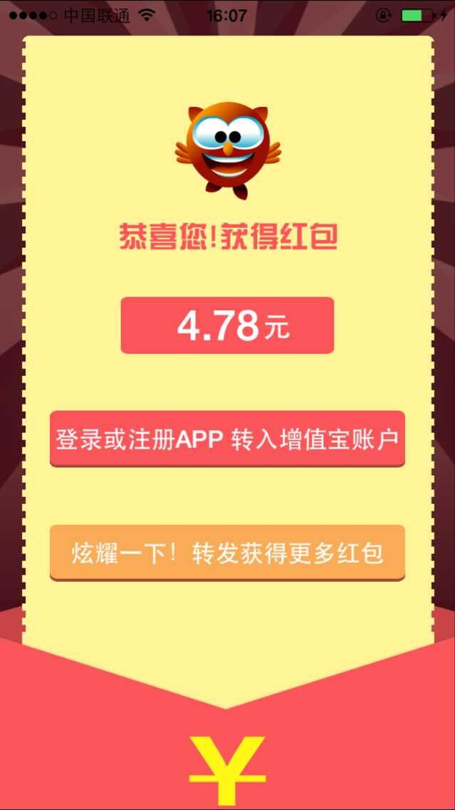 打开app后,会自动弹出“摇一摇”的活动,摇动你的手机即可看到所得奖励的金额,如下图,我中了4.78元。据说对抽中的奖励不满意可以卸载了再重新安装参与。