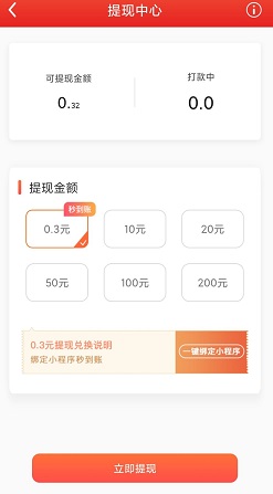 直接提现0.3元,秒到微信零钱!