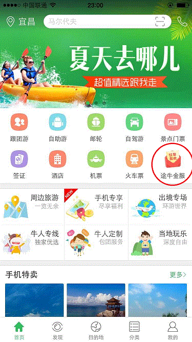 在各大手机应用商店搜索“途牛旅游”下载app,打开后找到“途牛金服”点击进入,如下图: