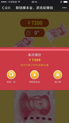 天财宝理财是北京中企明道征信有限公司推出的一款类似银行活动存款的理财产品,依托于微信上即可操作,这次活动也是需要通过在微信上即可完成,参与数钱游戏,手再残也可以数到5000元体验金,预计7天产生11元利息,据说能直接提现!