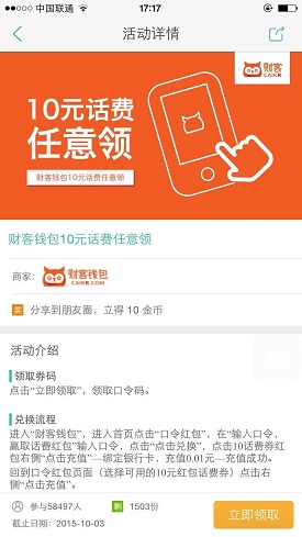 2.打开app,点击右上角的搜索按钮,输入“财客”搜索,进入活动页面,如下图: