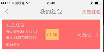 5.在“我的-我的红包”可看到你所领取的红包,点击提现,没绑定银行卡的会提示你绑定银行卡。