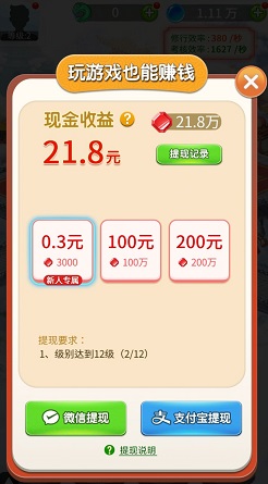 王者猜谜新春版是一个微信小程序,猜几个谜语凑到0.3元后,可提现秒到微信零钱!今夜斗僵尸,玩几把,看几个广告,进度条达到100%,即可提现0.3元,秒到微信零钱!我要养神仙,开始以为是嘉米游戏旗下的,后来发现只是长得像,合成12级后,提现0.3元到微信或者支付宝,秒到账!