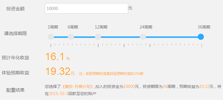 点击“去投资”,再点击“马上体验”,期限选择36周期,如下图: