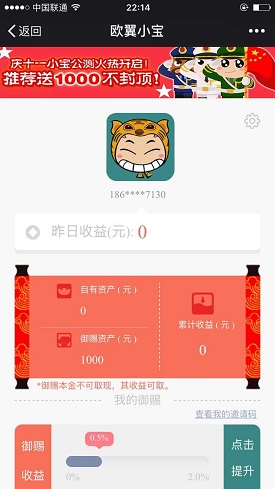 欧翼小宝是河南欧翼汽车销售服务有限公司旗下的一款依托于微信的理财平台,这个确定有点特别,不是金融公司。不过,活动完全免费,1000元体验金可产生30天预计6元左右利息,据说可直接提现,至于到时会不会改规则就不知道了!