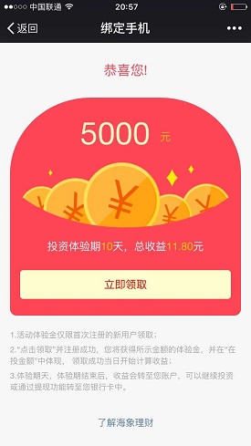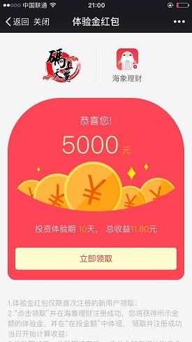1.打开微信,搜索“海象理财”(微信号:hybaiwenbaida)关注公众号。点击右下角-新手帮助-新手红包。输入手机号领取5000元体验金,但不要注册。