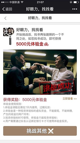 点击“好眼力,找找看”旁的挑战进入,找两幅图不同点,应该都是甄子丹第二颗纽扣那里不同。