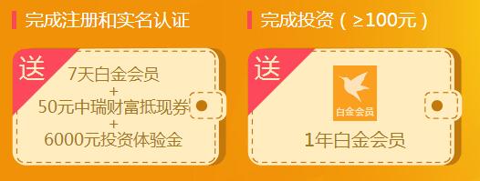 注册后完成实名认证和第三方支付的开通,即可免费得到7天白金会员,6000元体验金,50元中瑞财富抵现券。