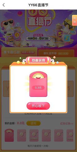 YY66直播节活动,活动期间,进入后,每天做任务集卡,可以合成红包,每次金额随机几毛,累计达到1元即可提现到支付宝,刚才我随便点了下,合到了0.3元。早点参与,就能多赚点。