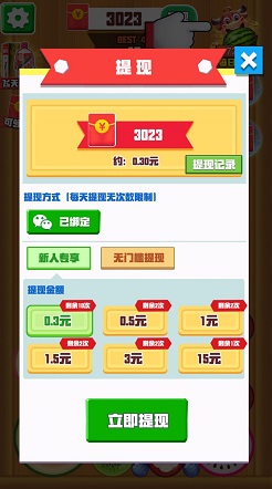 贪玩是一个游戏,看几个广告进度条就可以达到100%,提现0.3元,秒到微信零钱!西瓜爱消除,这次版本号0.8.2,玩法还是老一套,多次提现0.3元和其他小额。大西瓜小芝麻,我看一个广告就拿到3000红包券,提现0.3元,秒到微信零钱!