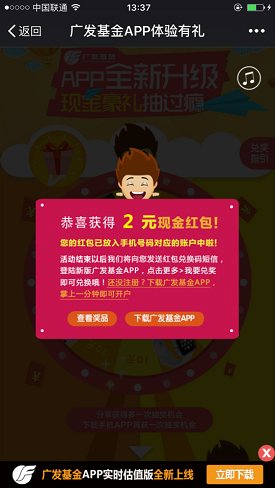 广发基金也是做过多次活动的基金公司了,这次通过微信举办了app体验有礼活动,新老用户均可参与,经测试每个用户一天可弄到3次机会,每次至少可中2元,奖励是货币基金,到时可以直接赎回到银行卡的!