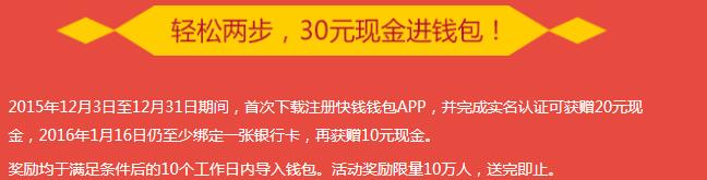 快钱钱包是快钱支付清算信息有限公司旗下的app,目前新用户首次下载注册快钱钱包app,完成实名认证后可获赠20元现金,到了2016年1月16日仍至少绑定一张银行卡,再获赠10元现金,名额有限,完全免费,大家抓紧时间尽管去做!